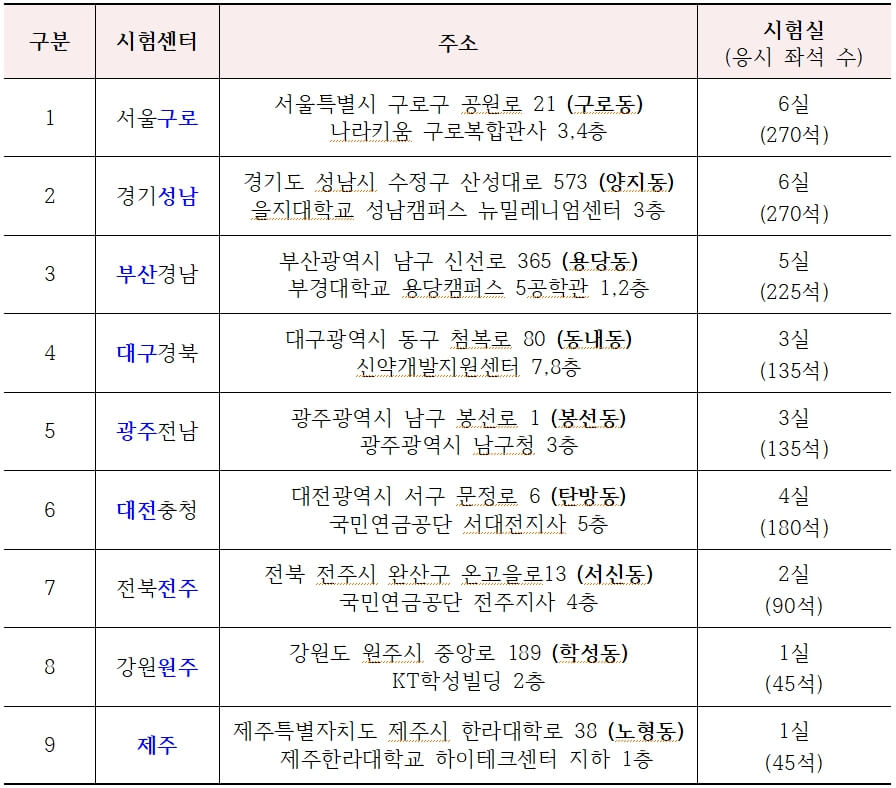 * 요양보호사 자격증 시험은 국시원 전용 아래 9개 시험센터에서만 시행되며, 시험센터 선택은 응시자의 주소지 및 교육기관의 소재지와 관계없이 선택 가능합니다.(단, 시험센터 상황에 따라 응시좌석 수는 일부 조정될 수 있습니다.